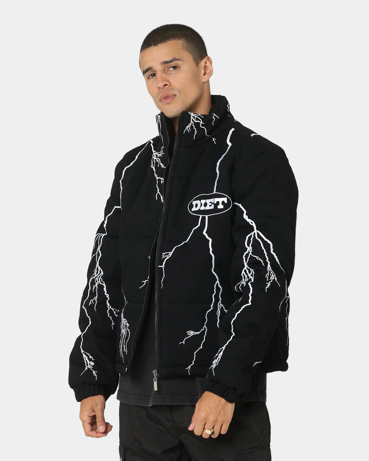 Diet Starts Monday brings the thunder with their new Bolt Puffer Jacket. It features a custom embroidered lightning bolt design all over for a unique look with an embroidered brand logo on the chest and a large cracked print logo on the back. This Aussie exclusive won’t last long.