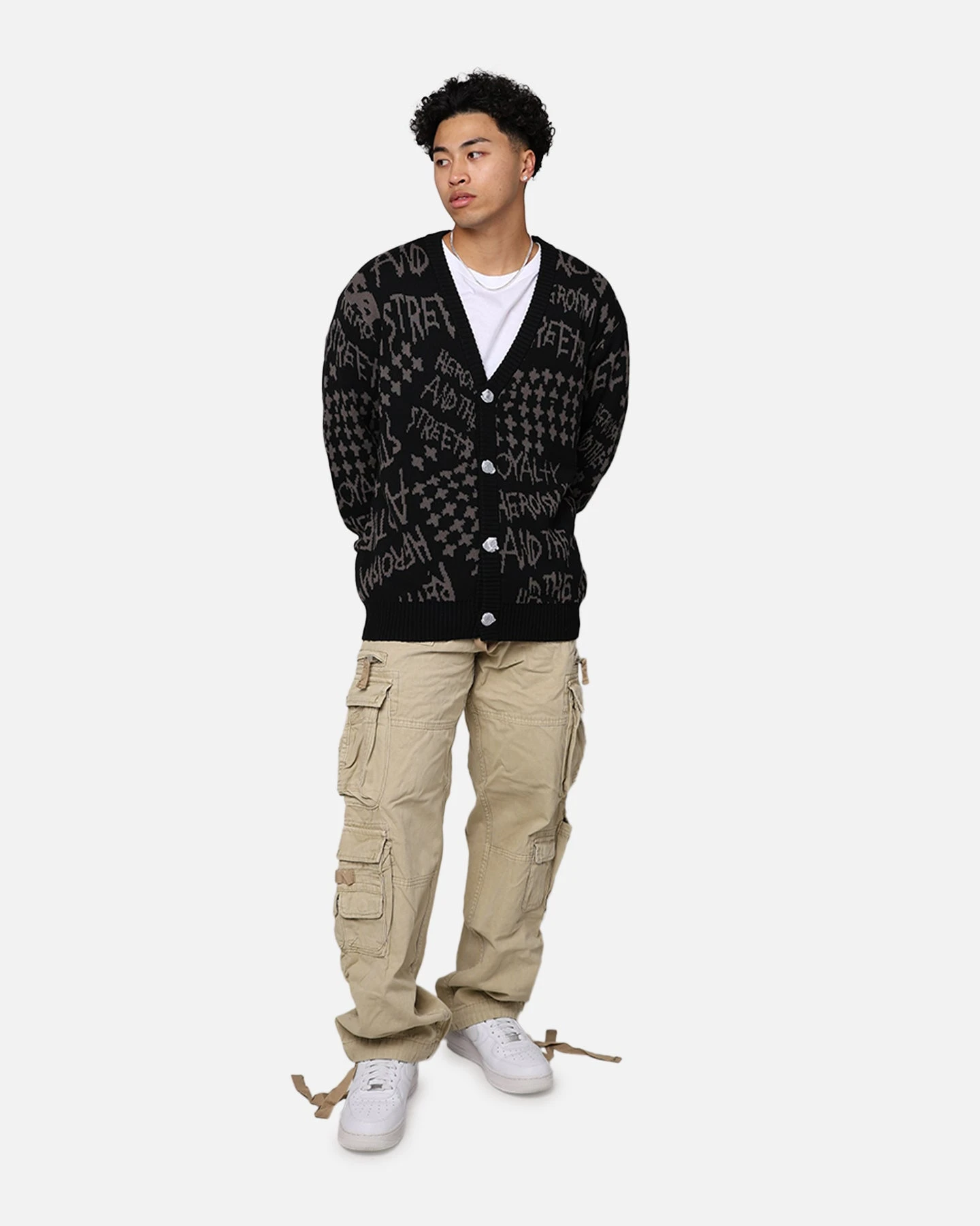 The Heroism Cardigan Black is a relaxed fit, knitted cardigan made from a lightweight cotton yarn This style features a 4 button closure at the front with an all-over Ksubi logo print mimicking the pocket tag. This cardigan is finished with signature t-box embroidery.