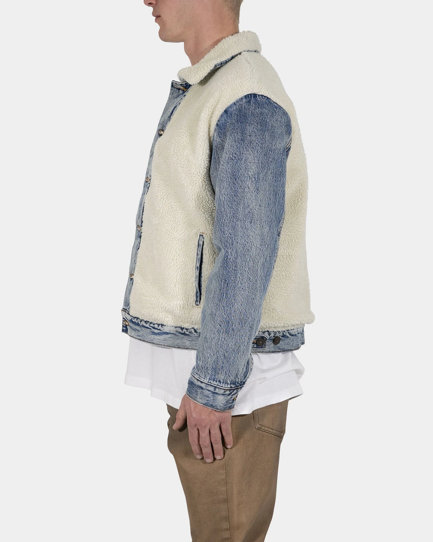 MNML knows how to do different and the Sherpa Body Trucker Jacket is proof of that. This jacket features a sherpa body panel with denim sleeves and trims and a full button-up closure to keep it toasty and stylish. MNML always has your back – Designed to last, this jacket is made with heavyweight rigid cotton denim, Sherpa. and a quilted inner lining for your comfort.