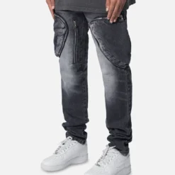 MNML Zipper Inseam Cargo Denim Jeans Washed Black