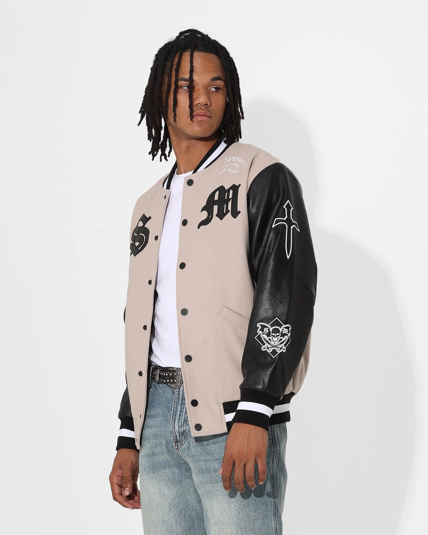 You’ll want to take a closer look at the Graveyard Varsity Jacket. A variety of mixed media Saint Morta graphics feature on a melton wool body and PU leather sleeves that make this jacket a premium piece to own.